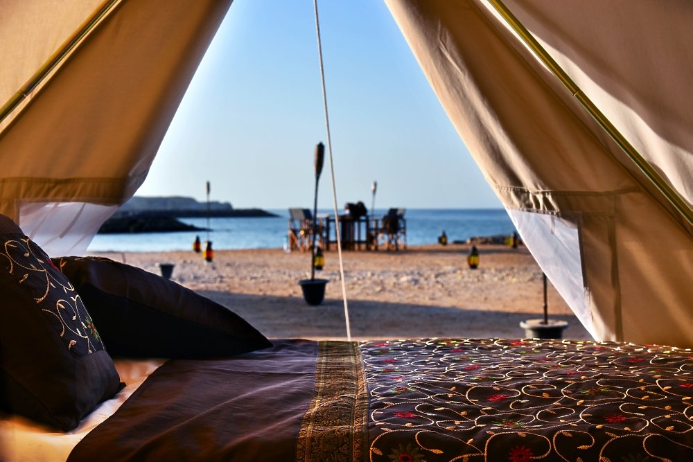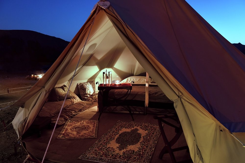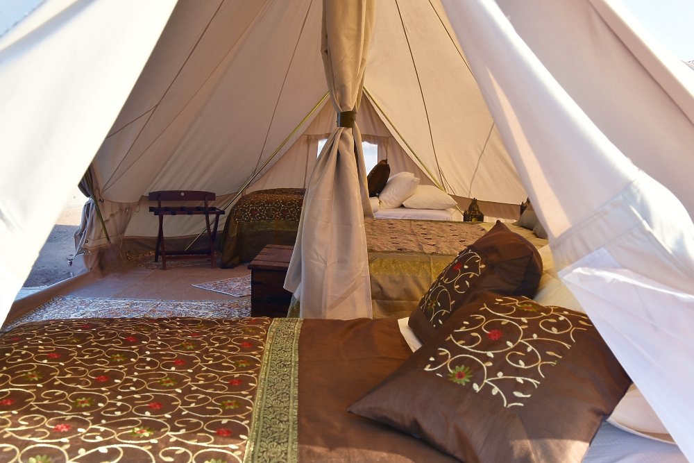 Mit über fünf Metern Durchmesser und einer maximalen Höhe von drei Metern sind die Zelte sehr geräumig und bieten Platz für ein vollwertiges King Size-Doppelbett mit hochwertigen Taschenfederkern-Matratzen und orthopädischem Topper. Jedes der etwa 15m² großen Luxuszelte besitzt ein individuelles Innendesign welches aus edlen Materialien des Orients zusammengesetzt ist. Iranischer Sisalboden, arabische Seidenteppiche und Seidenkissen sind nur ein Beispiel der handgefertigten Materialien. Vor den Luxuszelten sorgen orientalische Sitzkissen und eine Majlis für schattenspendende und gemütliche Stunden. Das private Badezimmer mit Holzboden, Toilette, Waschbecken, Bademantel und eine durch Solar erhitzte Warmwasserdusche befindet sich in einem separaten Zelt.