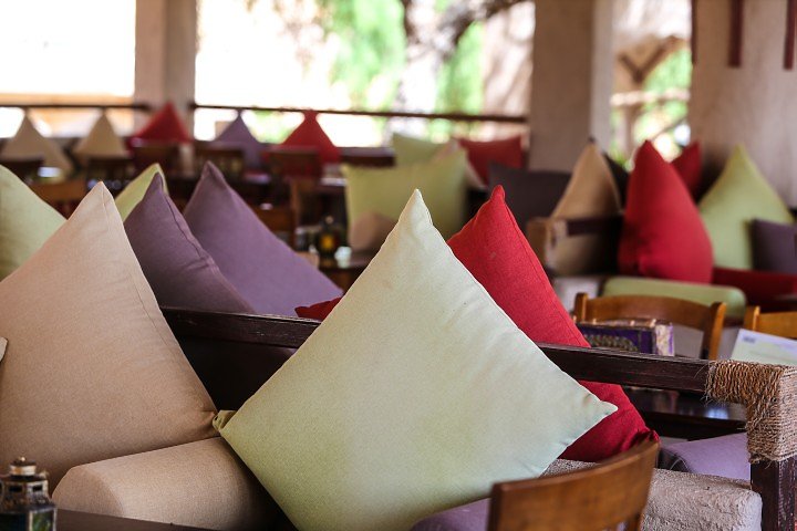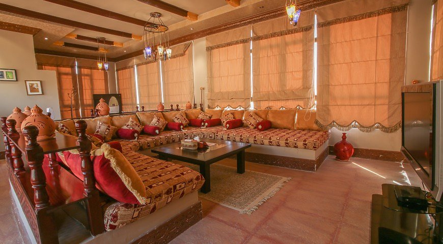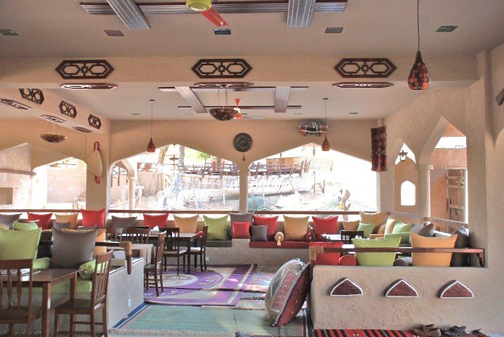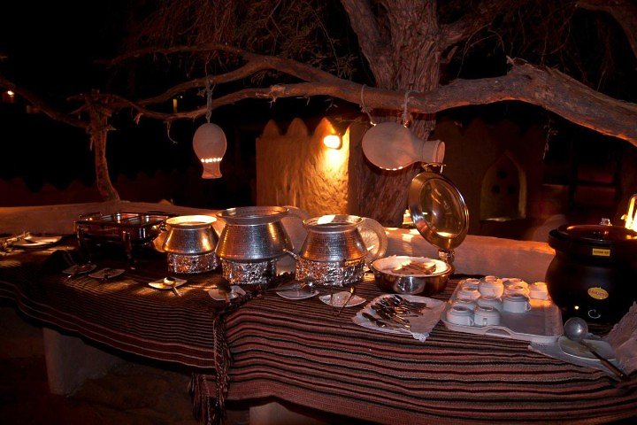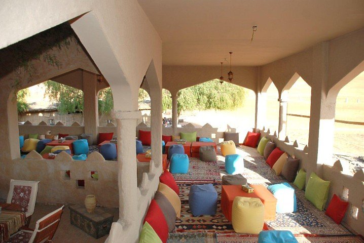 Im Restaurant mit Terrasse im modern arabischen Stil werden omanische und arabische Gerichte oder ein Barbecue serviert. Trinkwasser steht allen Gästen kostenfrei und uneingeschränkt zur Verfügung. Sitzgelegenheiten mit großen Kissen laden zum Verweilen ein.
