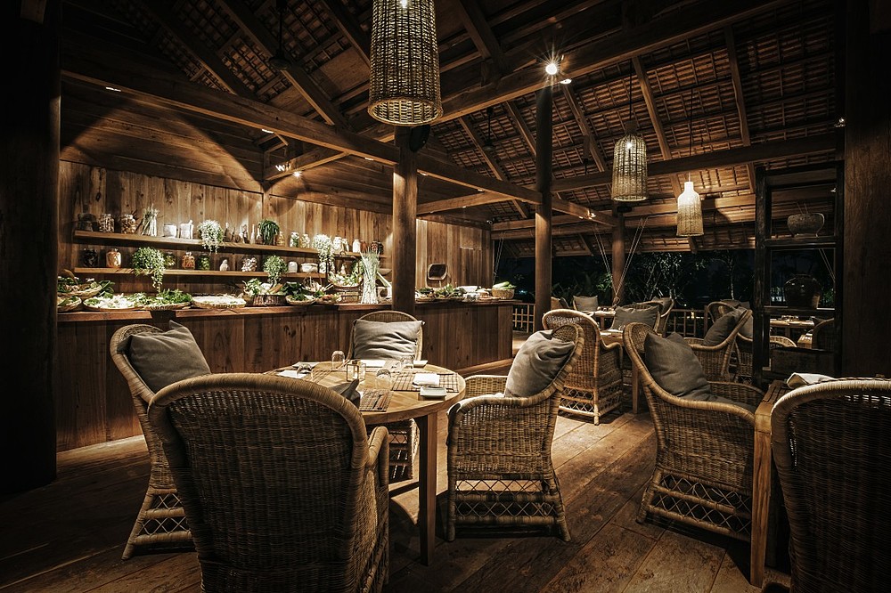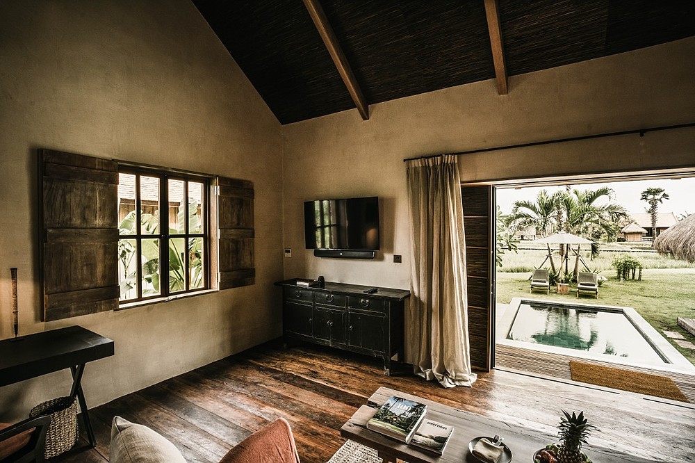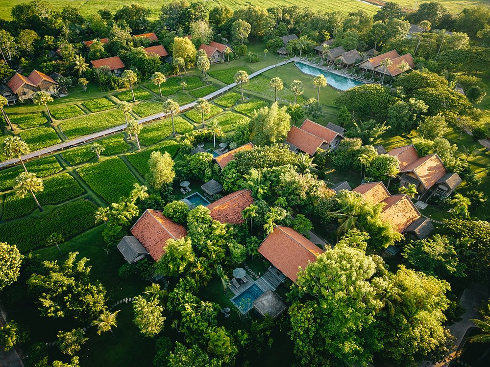 Natürlich, ästhetisch, luxuriös: 45 auf Stelzen erbaute Holz-Villen erwarten Sie inmitten Reisfelder und einem üppigen Garten mit Palmen und Frangipanis. 25 Villen sind mit einer privaten Terrasse ausgestattet, 20 besitzen einen privaten Pool. Handgefertigte Designermöbel aus Holz, Stein, Rattan und Lehm sorgen für ein äußerst geschmackvolles Interieur und eine wohlige Wohnatmosphäre.