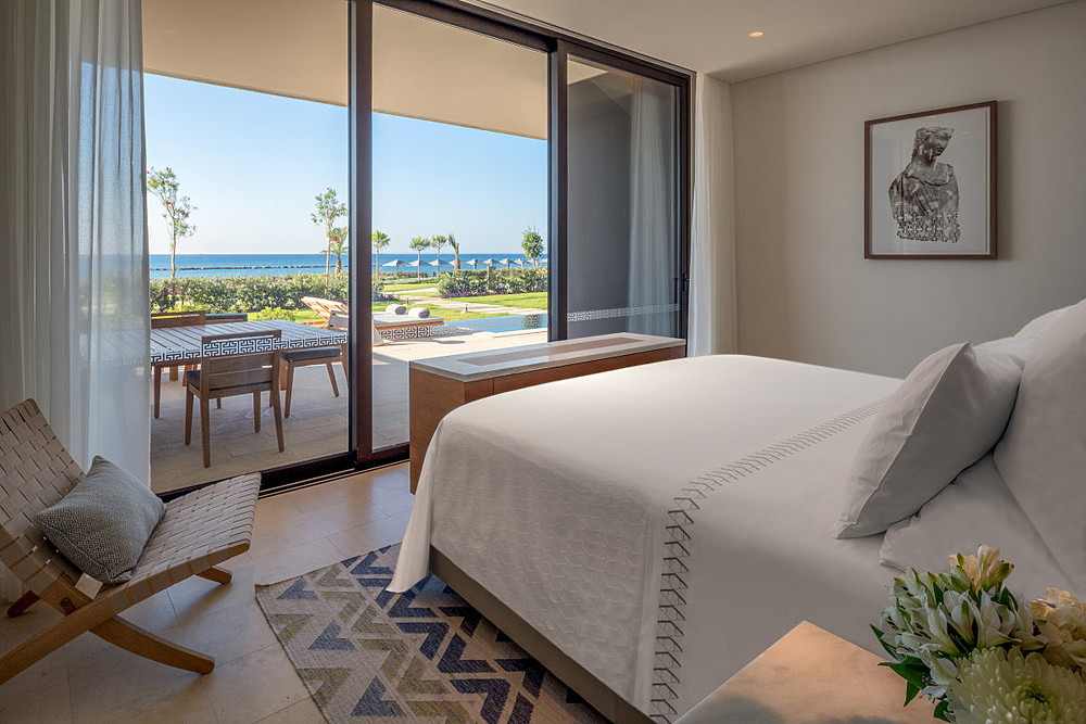 Zur Ausstattung aller Zimmer und Suiten zählen: Meerblick vom Balkon oder der Terrasse, Smart TV, Safe, einmal täglich nd kostenfrei aufgefüllte Minibar mit Wasser, Säften und Softdrinks, Telefon, Zubereitungsmöglichkeiten für Tee und Kaffee/Nespresso Maschine, automatisches Lichtsystem, USB-Anschlüsse, Klimaanlage zum Heizen und Kühlen, automatisches Gardinensystem, Kissen-Menü, Fön, Bademantel und Slipper.