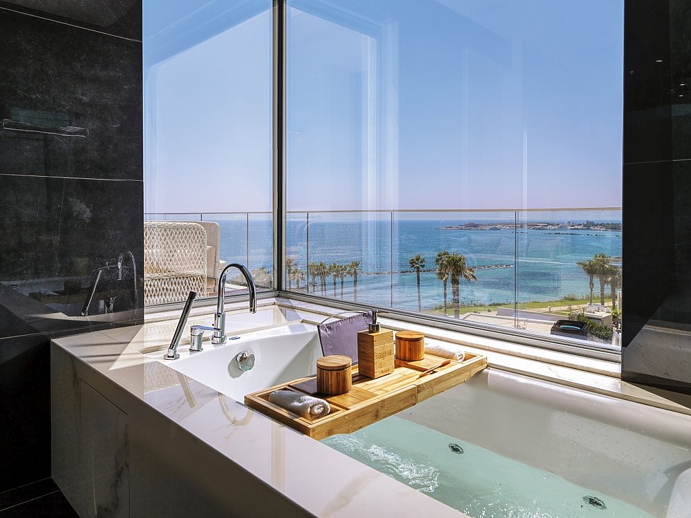 Die Junior Suite ist mit einem großen Doppelbett und einem Badezimmer samt Badewanne und separater Regendusche ausgestattet. Traumhafter Meerblick erwartet Sie von der ca. 23m² großen Terrasse/Balkon.
