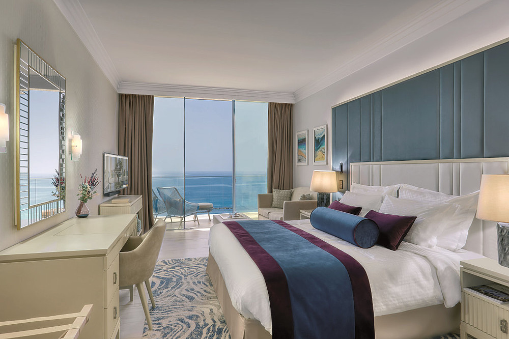 Die Promo Zimmer sind wahlweise mit großem Doppelbett oder zwei Einzelbetten ausgestattet. Das Badezimmer verfügt über eine Badewanne mit großem Fenster zum Schlafzimmer. Das Fenster kann mit einem Rollo verschlossen werden. Der Balkon oder die Terrasse samt Meerblick sind ca. 8m² groß. Die Promo Zimmer entsprechen dem Deluxe Room Sea View, es ist jedoch eine geringe Zimmeranzahl verfügbar.
