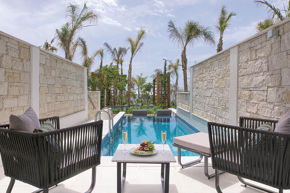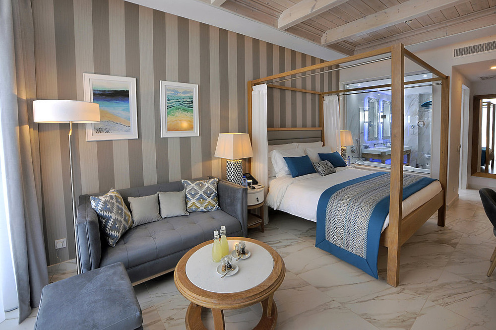 Die Superior Cabana Zimmer liegen im Erdgeschoss und sind mit einem großen Doppelbett und einem Badezimmer mit Regendusche und separater Badewanne ausgestattet. Auf der Terrasse mit Meerblick befindet sich der private Pool.