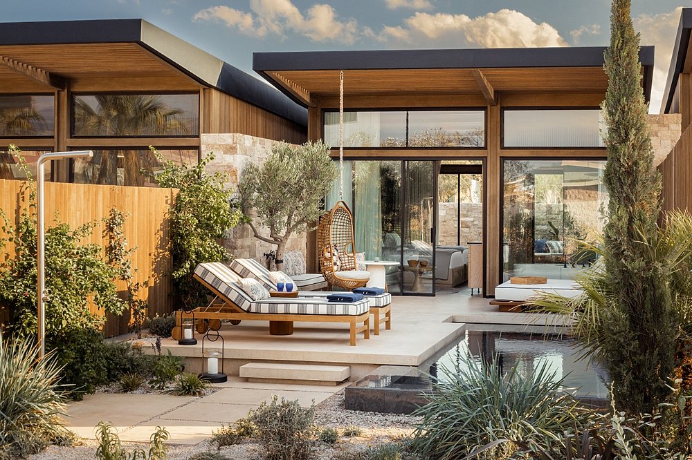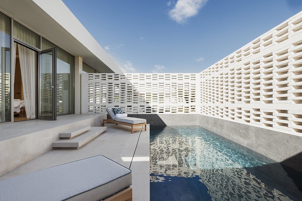 Der Aesthesis Bungalow verfügt über einen 87m² großen Außenbereich samt Privatpool mit Außendusche, Tagesbett und einem Außen-Kamin. Der Innenbereich ist in einem offenen Wohn- und Schlafbereich gestaltet und mit einem Marmorbad ausgestattet.