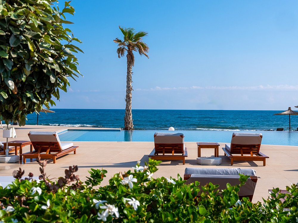 Die Deluxe Junior Suiten verfügen über einen Wohn- und Schlafbereich mit großem Kingsize Doppelbett und einem Sofa-Bett, ein Marmor Badezimmer mit Dusche und Badewanne samt Chromotherapie Licht. Auf der Terrasse befindet sich der 19m² große und individuell beheizbare Privat-Pool. Für Temperaturen über 22 Grad fällt eine Gebühr an. Die Kategorie Front Sea View liegt am Hauptpool und somit auch nah am Strand.