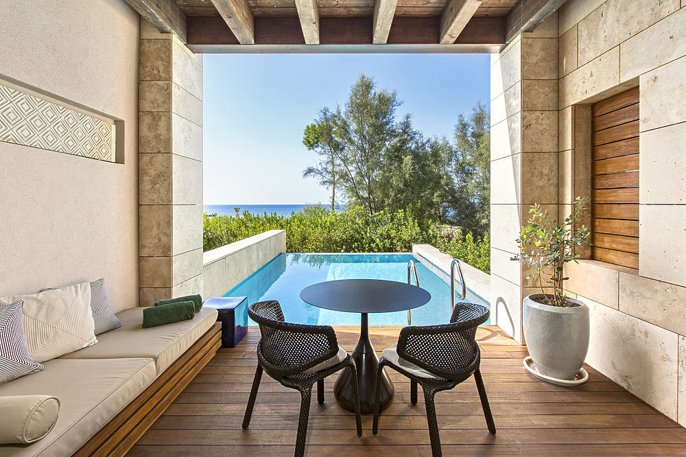 Die Premium Infinity Zimmer liegen in erster Reihe zum Meer mit traumhaften Meerblick. Zudem verfügt das Zimmer über einen privaten Pool (im Oktober beheizt).