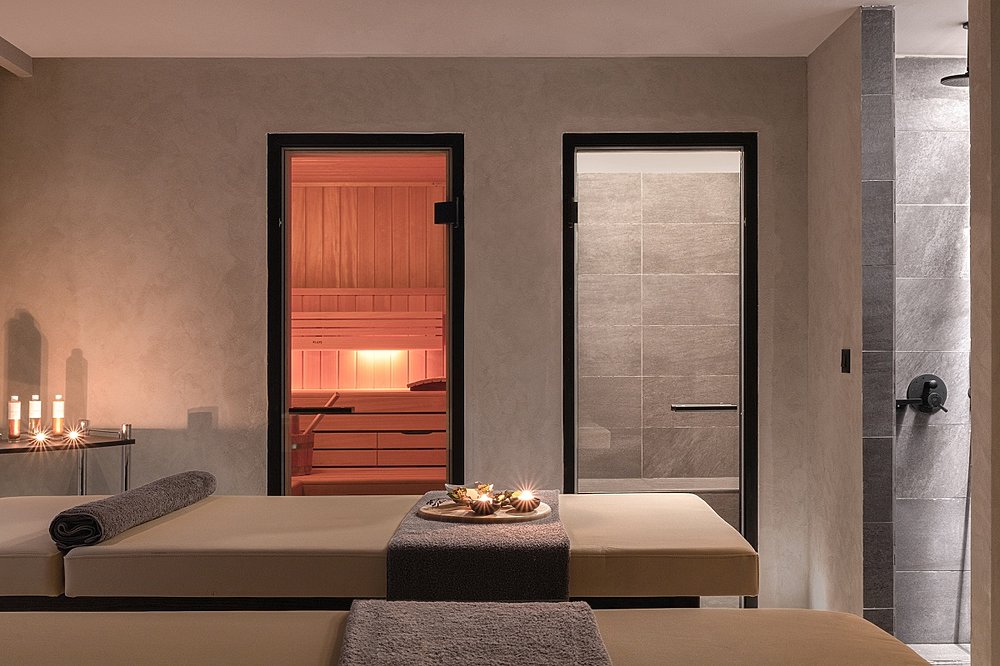 Die geräumige Suite verfügt über ein Kingsize-Bett, ein Schlafsofa und ein Armchair-Bett. Der Wohn- und Schlafbereich ist durch einen Sichtschutz voneinander getrennt. Zudem gibt es eine möblierte Veranda und eine eigene Sauna sowie der Zugang zum Pool.