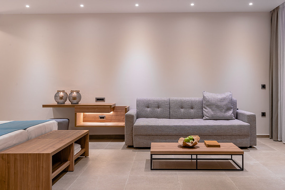Die Suiten sind sehr großzügig und verfügen über einen separaten Bereich in dem das Schlafsofa platziert ist. Das Badezimmer ist zum Schlafbereich hin offen gehalten. Der Blick von der eigenen Terrasse oder dem eigenen Balkon führt zum Meer.