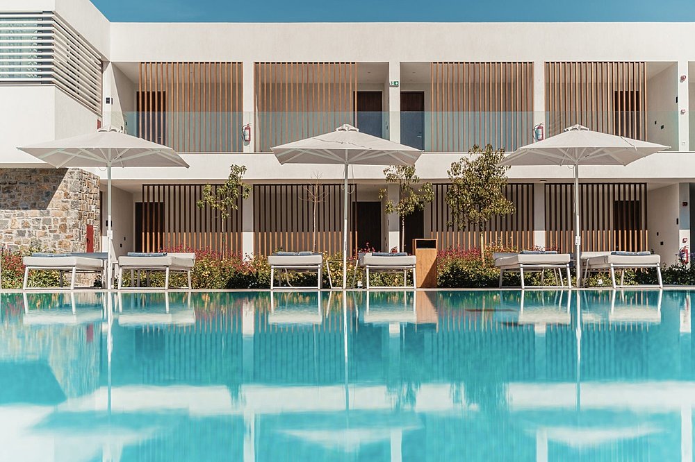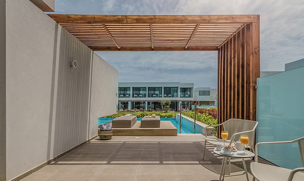 Die Junior Suiten mit privatem Pool sind in einem offenen Raumkonzept gehalten und verfügen über eine Terrasse mit Blick auf das Meer. Auf der Terrasse befindet sich der eigene Pool (nicht beheizt).