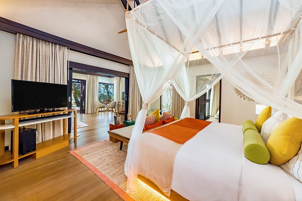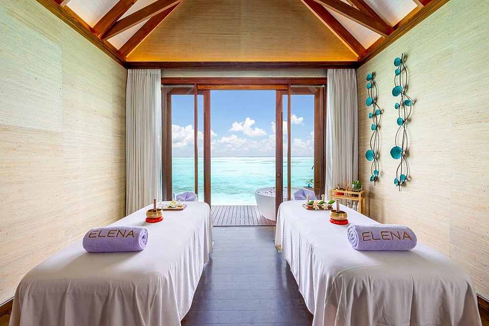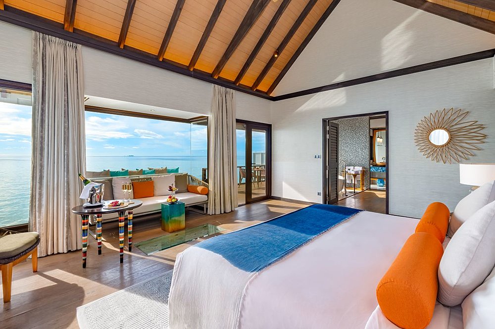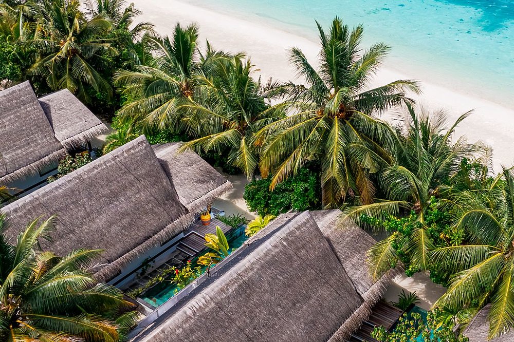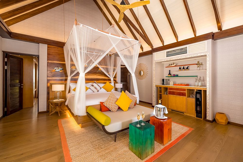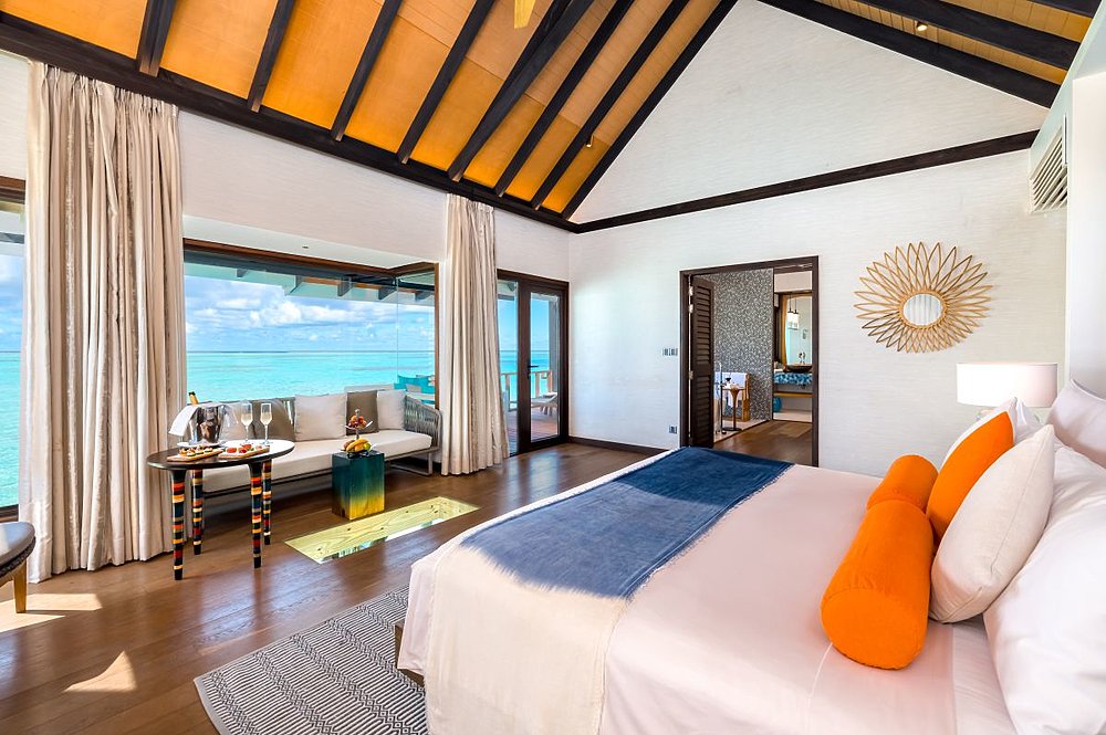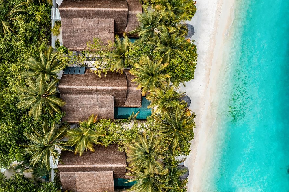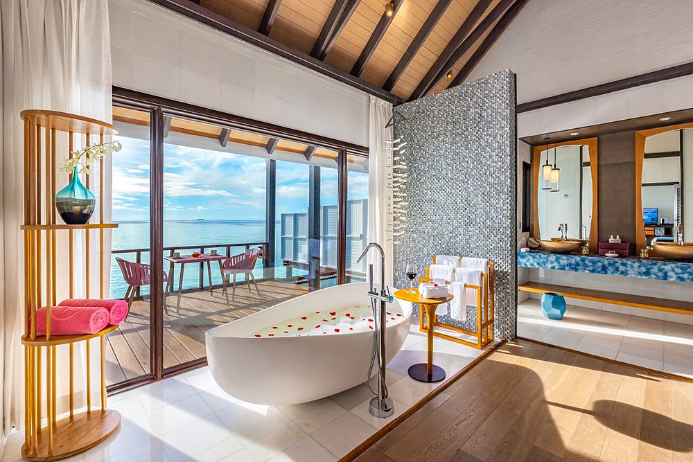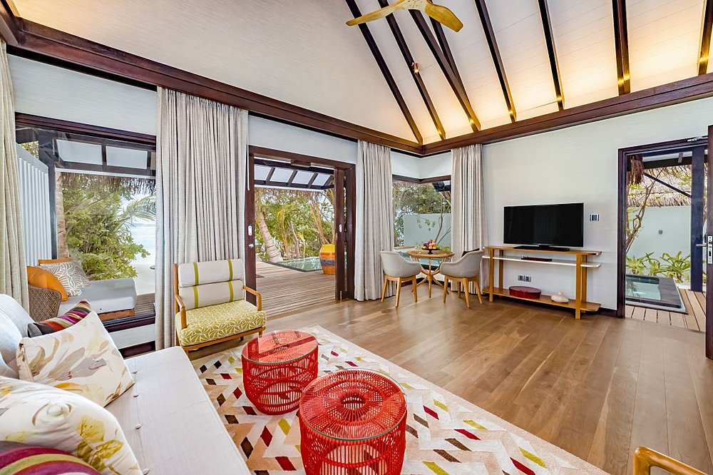 Jede der insgesamt 90 Unterkünfte verspricht für Sie ein einzigartiges Wohnerlebnis. Ob nach Westen oder Osten ausgerichtet: In jeder Villa erleben Sie spektakuläre Sonnenuntergänge oder -aufgänge. Sie haben die Wahl zwischen einer Villa direkt am weichen unberührten Sandstrand mit Blick auf den Horizont oder den einzigartigen Überwasser-Häusern, in denen Sie eine romantische Atmosphäre genießen. In allen Wohnräumen trifft modernes Design auf Natur und Lebendigkeit: Gedeckte Erdtöne werden durch satte Farbakzente ergänzt. Die Einrichtung ist hell, offen und gleichzeitig gemütlich. Jede Villa ist umgeben von den tropischen Pflanzen und Blumen der Insel, besitzt eine großzügige Holzterrasse und ein exklusives Outdoor-Badezimmer mit Badewanne und Dusche.