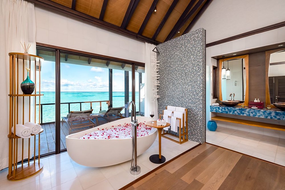 Erfrischend, romantisch und inspirierend! In der Lagune liegt der lange Holz-Jetty mit den Wasservillen, die feinsäuberlich aneinandergereiht auf Stelzen im Indischen Ozean stehen. Jede Villa hat ein Badezimmer mit freistehender Badewanne mit Blick über das Meer in Richtung Horizont.