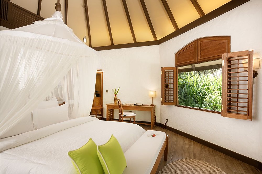 Die 98 Unterkünfte des Resorts sind edel eingerichtete Bungalow-Villen, die sich durch ihre natürliche Bauweise harmonisch in die Inselnatur einfügen. Edle Holzelemente und ein dezent moderner Stil sorgen für eine unaufgeregte Atmosphäre zum Wohlfühlen. Traditionelle Strohdächer und handgeschnitzte Möbel verströmen den typischen maledivischen Charme. Von Ihrer privaten Terrasse bietet sich Ihnen ein atemberaubender Blick auf den funkelnden Ozean oder ins satte Grün der tropischen Pflanzenwelt.