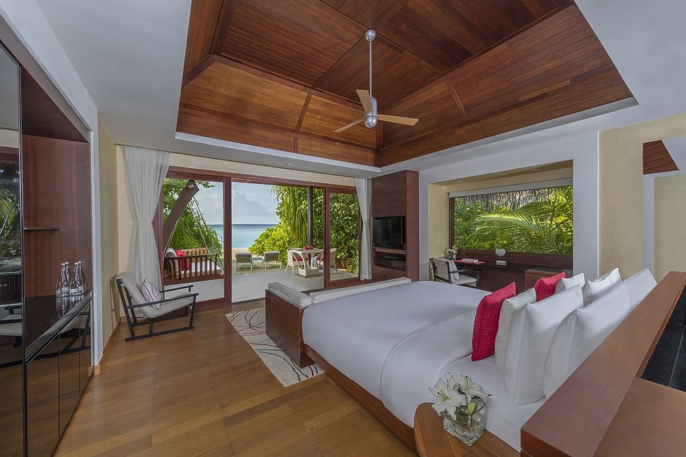ausgestattet wie die Beach Villa mit privater Terrasse und Blick in Richtung Sonnenuntergang