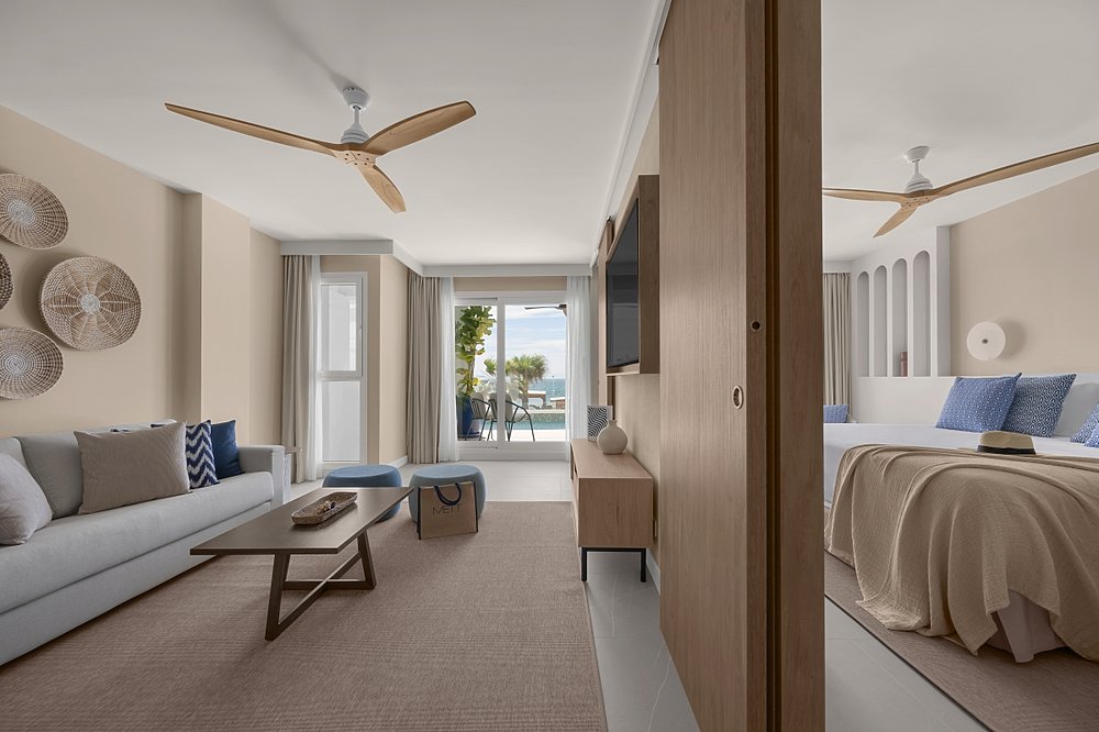 Die Sea View Suite with Pool bietet neben dem Schlafbereich einen kombinierten, großen Wohnbereich sowie eine mit Stühlen und einem Tisch möblierte Terrasse mit Meerblick und Zugang zum Swim up Pool (nicht privat).