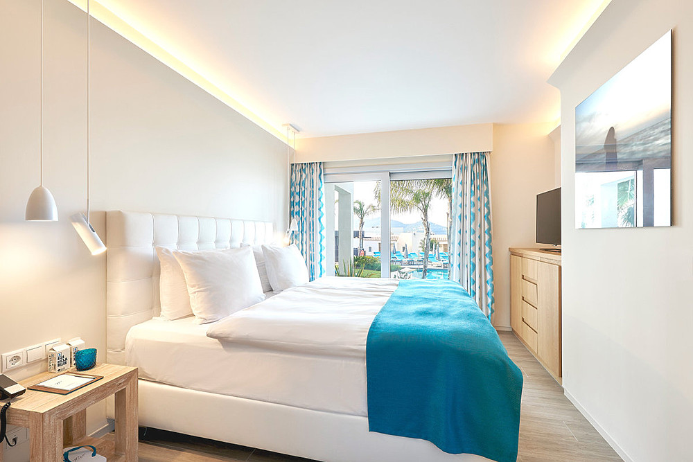 Die Laguna Suiten zeichnen sich durch die unmittelbare Lage direkt am Lagoon-Pool aus. Sie verfügen über ein Schlafzimmer und ein separates Wohnzimmer. Die Laguna Suite Infinity liegt auf der ersten Etage und bietet teilweise Meerblick vom eigenen Balkon. Das Schlafzimmer kann mit einem Doppelbett oder zwei Einzelbetten ausgestattet werden.